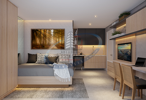 Apartamento de 1 dormitórios, área útil de 26m² planta com configuração funcional, garantindo boa setorização dos ambientes e uma